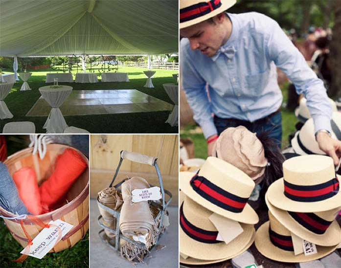 The next is keeping guests comfortable. If the outdoor wedding is in summer, shade is very important, place huge outdoor umbrellas, prepare fans and flappy hats; if the outdoor wedding is in fall and winter, the space heater is a must, pashminas for the ladies that can be reused as gifts.