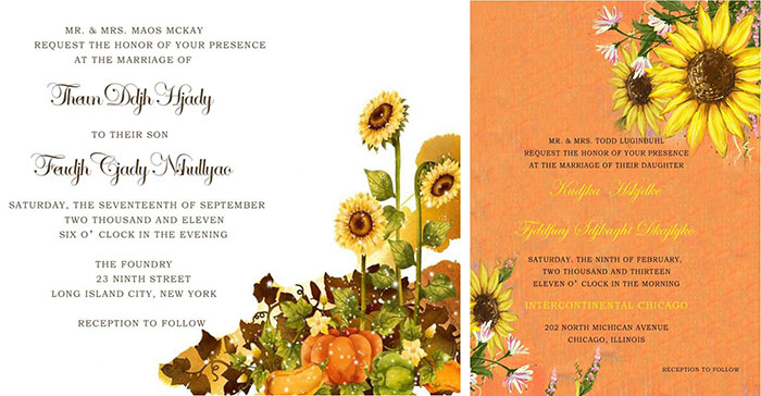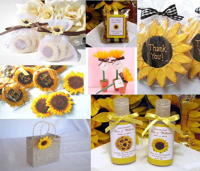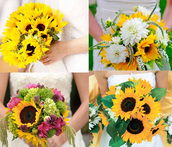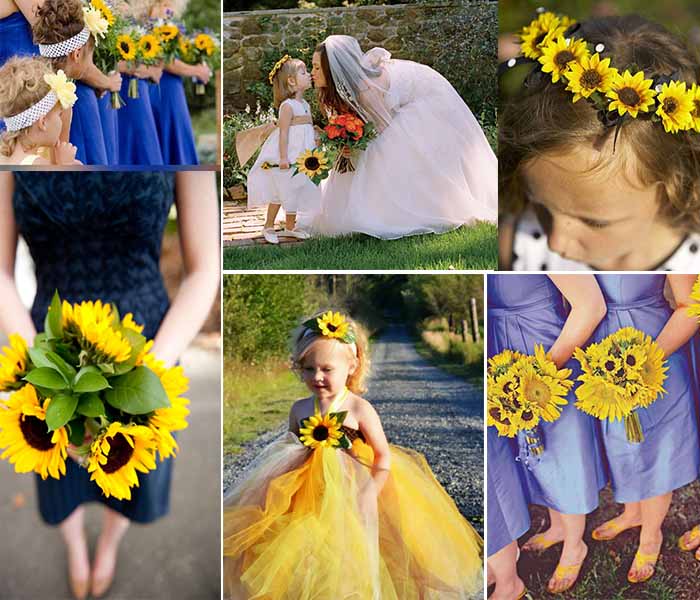 A chic bride could work sunflowers into almost everywhere of her wedding party, sunflower decorated wedding cake, sunflower centerpieces, sunflower bouquets, sunflower wedding favor, and even the hairstyle of bride and flower girls can be decorated with sunflower.