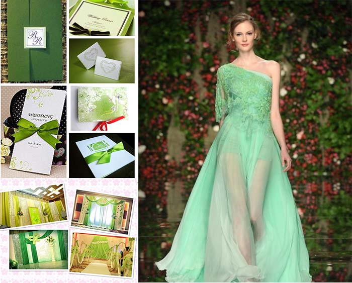 Green wedding invitations, prepared green wedding dresses, green bridesmaid dresses, green groom suit, sweet and fresh wedding cakes and deserts, and other green spot decoration, you will have a special unforgettable spring wedding party.