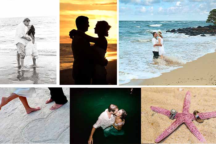 About photograph, there is some must- have photos: Silhouettes against the sunset; Capture a photo in front of the breaking waves; Draw a heart in the sand; Place your rings on a colorful starfish; Get close with the sea water; take the plunge together;