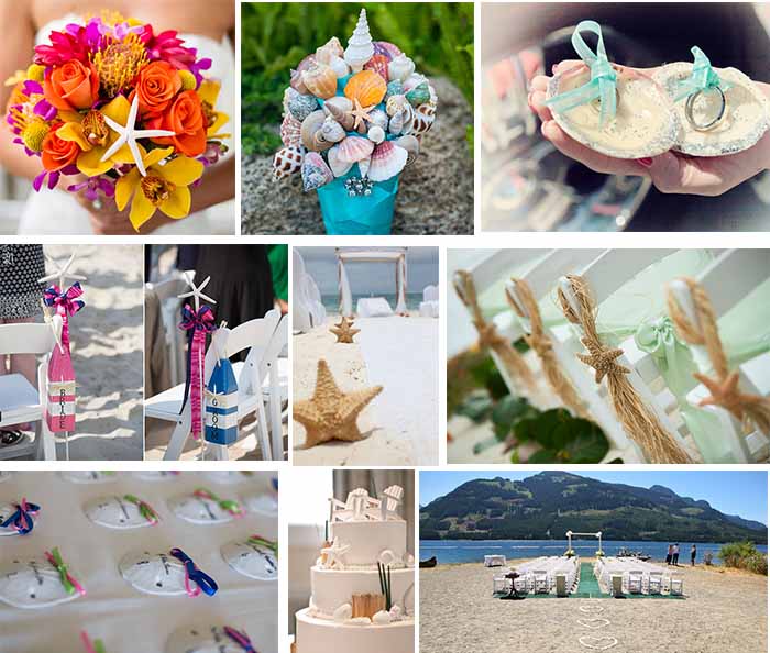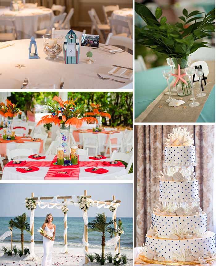About wedding decoration, stay nature of ocean backdrop, seashells and starfish are the best in their entire decor; choose colors contrast the sand and the surf rather than blend in, like corals, greens and other vibrant tones; Weight them down with shells, tie them to chairs with ribbon weight them down with shells, tie them to chairs with ribbon in case of wind blowing them away;