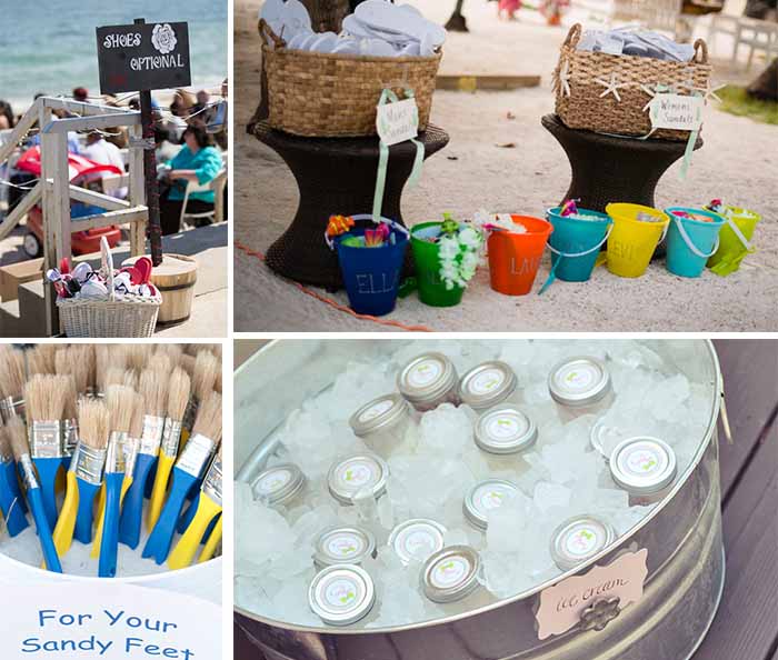 Keep the comfortable of your guests in your mind; prepare your guests travel-size bottles of good quality sunscreen, ice water, lemonade or a signature cocktail that guests can enjoy, provide a station guests can swap their shoes for flip-flops and wipe sand off their feet and classic towel;