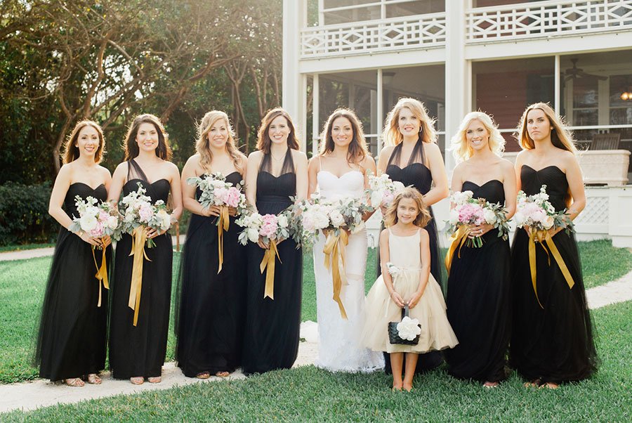 If you’re the brides who are white wedding gowns person, then black bridesmaid dresses would be your other option.
