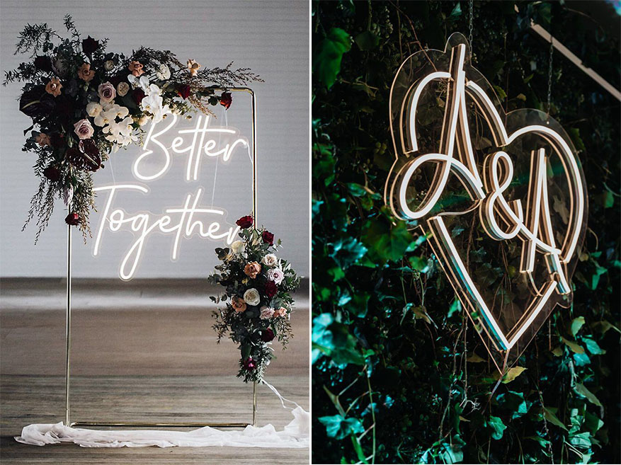4. Go with neon sign. It is something creative that reflect your theme compare to charming wooden sign, elegance mirriored sign. A fun neon slogan , wedding hashtag neon sign as a photo booth backdrop are both ways to incorporating neon sign into your unique wedding.