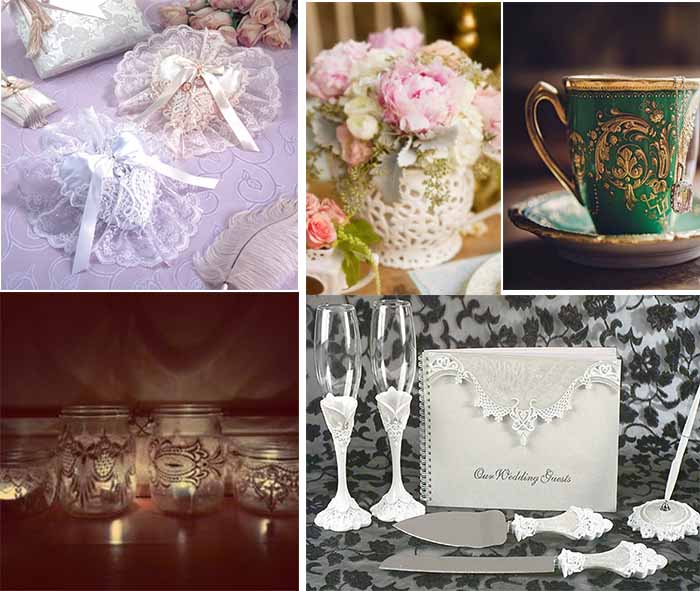 Decorate the avenue, table with lace, fine china, teacups, and candles, antique lamps or lamps fringed ivory silk scarves.