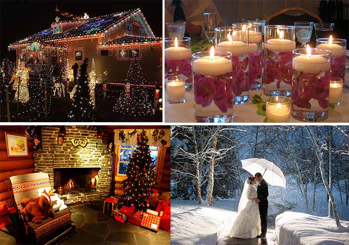 Crimson red and forest green, coupled with sparkling silver and gold are the traditional colors of Christmas wedding. But there are other different colors schemes can be considerate, white and gold, silver and light blue, silver and white, gold and cream etc.